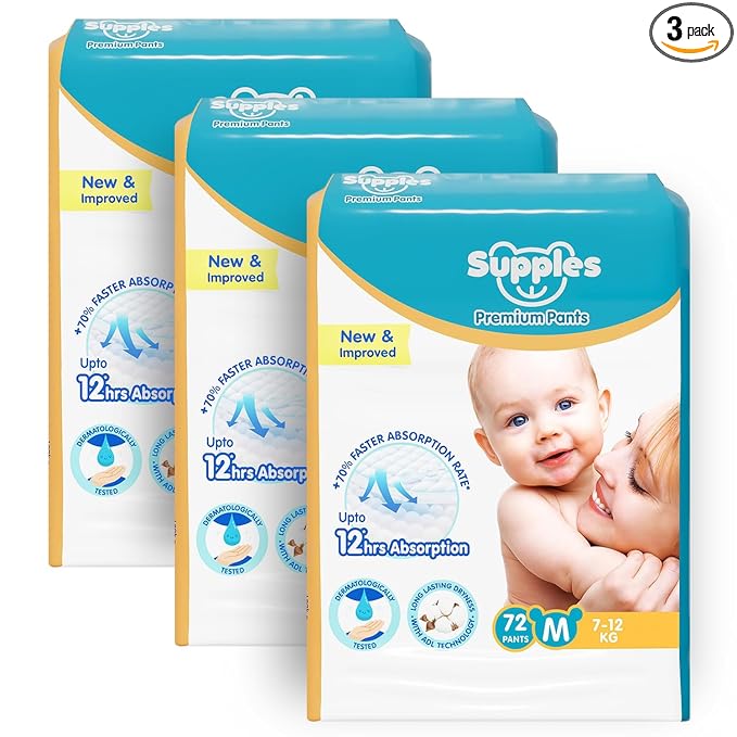 Supples Premium Baby Diaper Pants | 216 Baby Diapers | Medium | 7-12 Kg | 72 X 3 Packs | 12 Hrs Absorption | Cushiony Cotton Soft Fabric