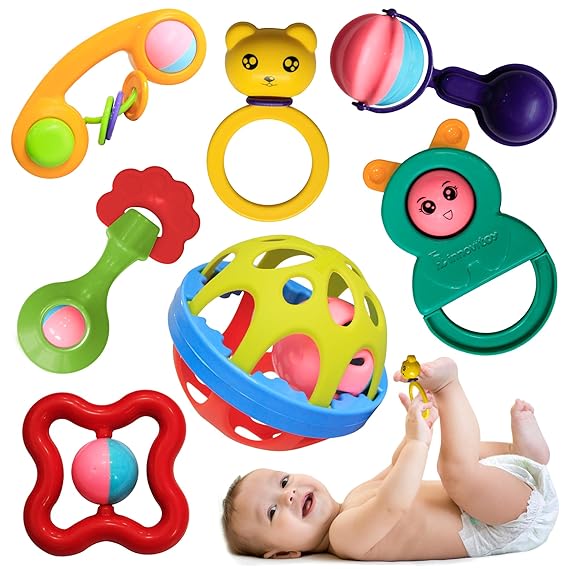 Innovitoy 7 Pcs Non-toxic Premium Rattle Set For Gifting | Safe Toys With Teether For New Born, Babies And Infants Of Age 1-3-6-9-12 Months