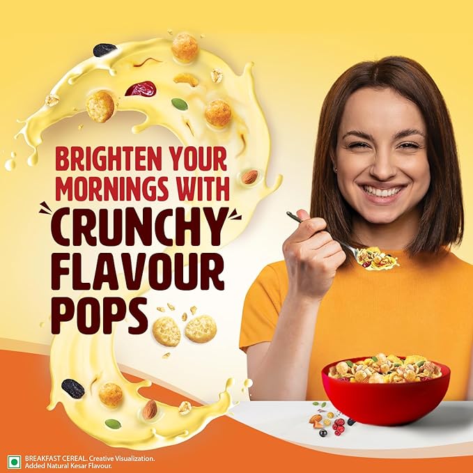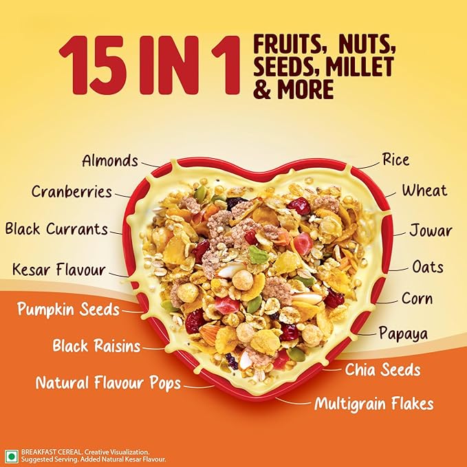 Muesli Kesar Crunch with Flavour Pops, 450 gm | 15 in 1 Fruit and Nuts, Seeds, Millet & more | Cereals for breakfast