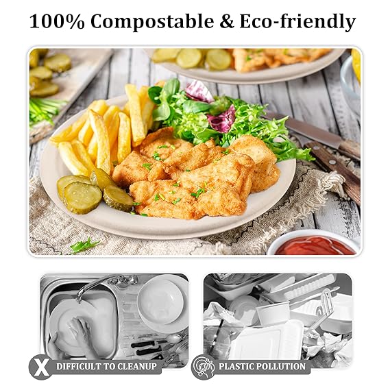 Paper Plates Set 250PCS Heavy-Duty Disposable Plate and Utensil Biodegradable Dinnerware for Party Sugarcane Plates, Extra Long Forks & Knives & Spoon